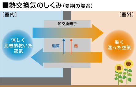 室外の暑く湿った空気は、熱交換素子を通過することで、室内の涼しく乾いた空気に熱と湿気を奪われ、冷やされてから室内に取り込まれます。