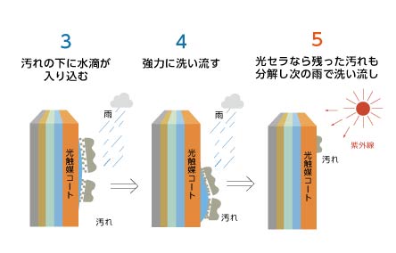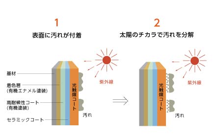 光セラ表面に付着した汚れを太陽のチカラ(紫外線)で分解し、付着力を弱めます。